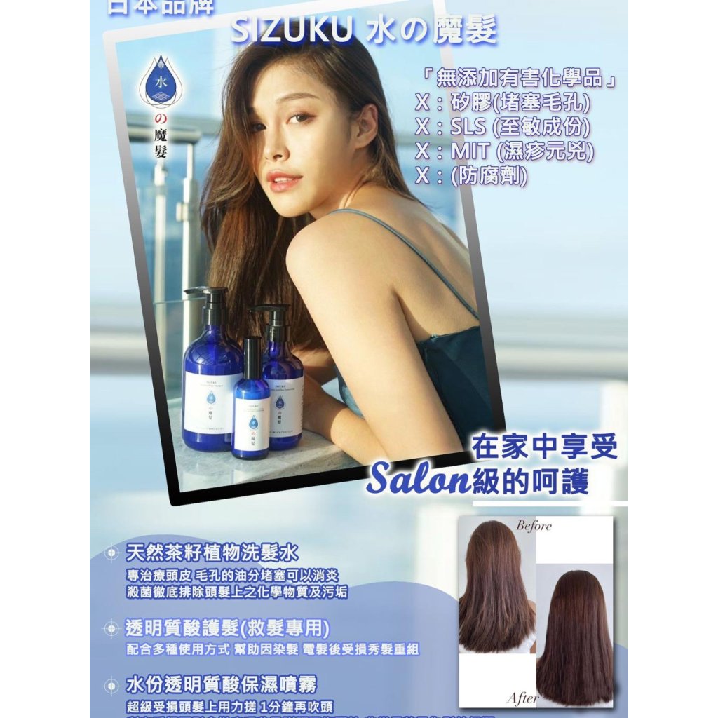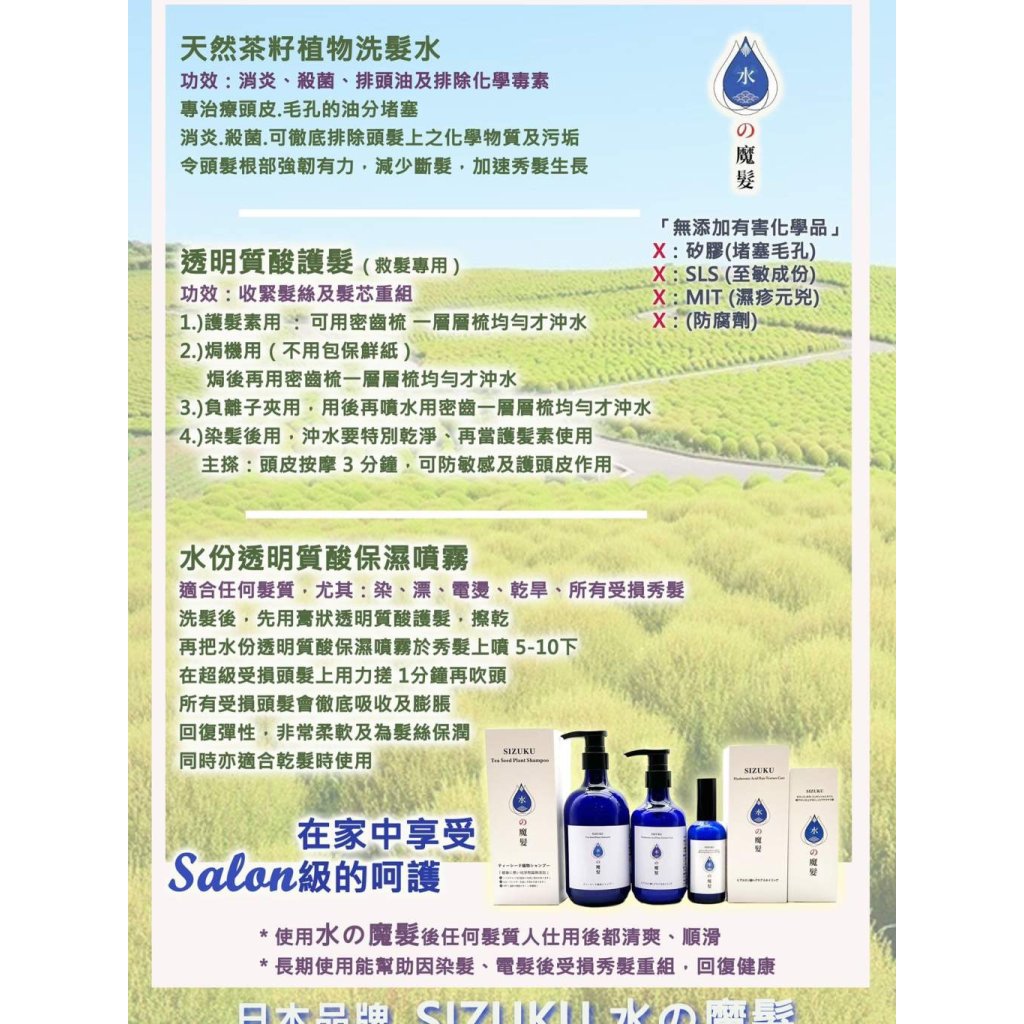 1. 先用本品牌茶籽植物洗髮水,先洗去秀髮上毒素及頭油,再用透明質酸鎖水護髮素塗抹頭髮至髮尾,按摩1-2分鐘然後沖水